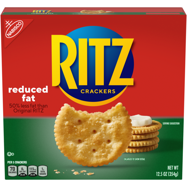 Products | Ritz Crackers Products | Ritz Crackers Everyone, and every taste, is welcome. Originals Our classic recipe is perfect for any pairing. RITZ ORIGINAL CRACKERS 13.7 OZ RITZ ORIGINAL CRACKERS 10.3 OZ RITZ ROASTED VEGETABLE CRACKERS 13.3 OZ RITZ HONEY WHEAT CRACKERS 13.7 OZ RITZ GARLIC BUTTER CRACKERS 13.7 OZ RITZ REDUCED FAT CRACKERS 12.5 OZ Nabisco Ritz Crackers 13.7 oz - SmartLabel™ Nabisco Ritz Crackers 13.7 oz - SmartLabel™ 80 Calories 1 Sat Fat (g) 105 Sodium (mg) 1 Tot Sugars (g) Nutrition Facts About 24 Servings Per container Serving Size 5 crackers (16g) Amount Per Serving Calories 80 % Daily Value * Total Fat 4.5 g 7.0% Saturated Fat 1 g 3.0% Trans Fat 0 g Cholesterol 0 mg 0.0% Sodium 105 mg 4.0%