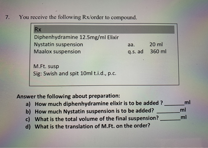 Which of the following auxiliary labels should be affixed to a prescription for diphenhydramine elixir?. Review For The NAPLEX | PDF - Scribd What total quantity of tablets should be dispensed for the following prescription? Rx: Prednisone 5 mg Sig: 10 mg qid 2 days 10 mg tid 2 days 10 mg bid 2 days 5 mg tid 2 days 5 mg bid 2 days Then stop. Qty qs a. 23 tablets b. 25 tablets c. 46 tablets d. 50 tablets 27. What quantity should be dispensed for the following prescription? (PDF) Pharmaceutical Calculations 13th - Ansel - Academia.edu Enter the email address you signed up with and we'll email you a reset link. Test: PCTB - Practice Questions | Quizlet Depending on store procedures and on state laws, the container label may be a. affixed to the container by the person generating the label. b. affixed to the container once checked by the pharmacist. c. affixed to the back of the prescription once filled. d. both a and b e. All of the above; Which of the following are not treated with Methotrexate? Medical Review Quizlet Flashcards | Quizlet Which of the following auxiliary labels should be affixed to a prescription for Diphenhydramine elixir? A. May Discolor Urine B. May Cause Drowsiness C. Take with Food or Milk D. Shake Well and Refrigerate