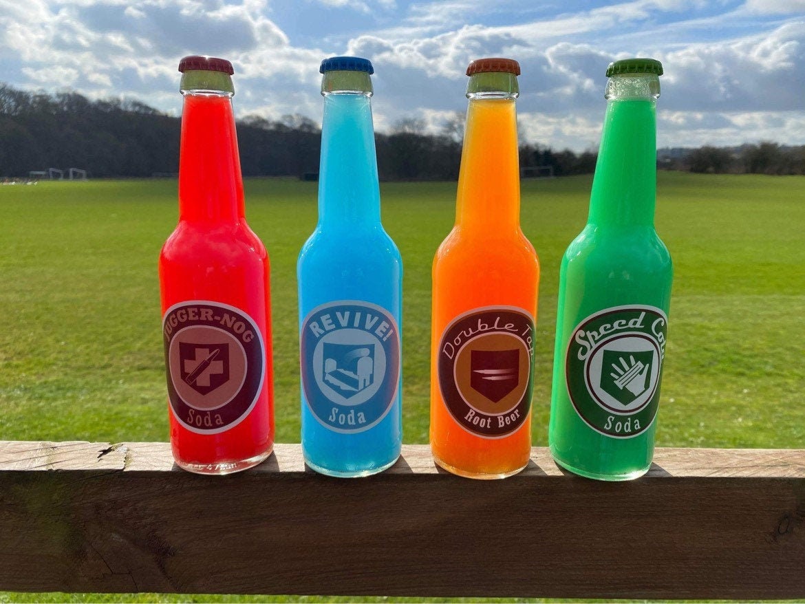 How to make your own glowing perk bottles! (Stickers included) Here is my complete collection of labels for all 14 perk bottles. All of these are scaled for 12 oz bottles, such that I used. Just print them out with highest quality possible on shiny photo paper. Then, cut them out and glue them onto the bottles. (A standard glue stick will work) Front Labels (Big oval on front of bottles)