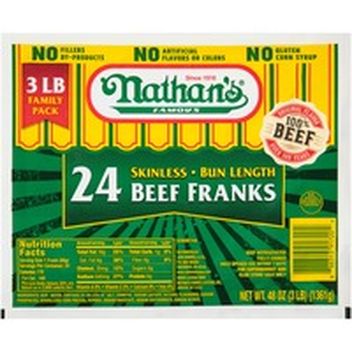 Nathan's Bun Length Skinless Beef Franks - Shop Meat at H-E-B Nutrition Facts Bun Length Skinless Beef Franks Serving Size 1.00 link (43g) Serving Per Container 8 Amount Per Serving %DV IS or Contains: Gluten Free *Percentage Daily values are based on a 2,000 calorie diet.Your Daily values may be higher or lower depending on your calorie needs we recommend $5.01 each ($0.42/oz) Add to list Add to cart Nutrition Facts Hot Dog nathan's famous nutritional information - march 28, 2018 nathan's famous hot dogs nathan's famous 8:1 natural casing hot dog 100 g 290 160 18 6 Brand Energy Safway Calorie Breakdown: 41% fat, 43% carbs, 16% prot Nutrition information for Hot Dog If you use the self-service fountain inside the restaurant for your drink order, see the sign posted ... Nathan's Famous Hot Dogs & Restaurants | Nathan's Famous Find out about Nathan's Famous hot dogs and restaurants. Get to know our products, like our world famous beef franks, fries, pickles, condiments and more. Nathan's Hot Dog (Sam's) From Nathan's Website - Nathan's Hot Dog ... 1 hot dog w bun 290 Cal 33% 24g Carbs 52% 17g Fat 15% 11g Protein Track macros, calories, and more with MyFitnessPal. Join for free! Daily Goals How does this food fit into your daily goals? Calorie Goal 1,710 cal 290 / 2,000 cal left Fitness Goals : Heart Healthy Fat 50g 17 / 67 g left Sodium 1,590g 710 / 2,300 g left Cholesterol 265g