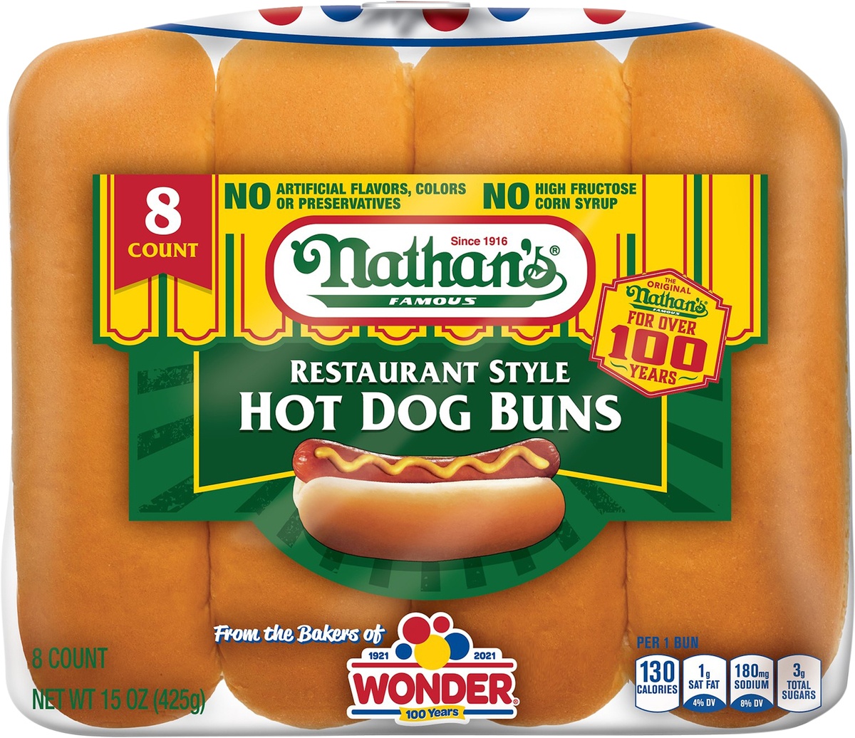Order Acme - Nathans Hot Dog Buns, Restaurant Style Hot Dog Buns, Restaurant Style. No artificial flavors, colors or preservatives. No high fructose corn syrup. Since 1916. From the bakers at Cobblestone Bread Co. The Original Nathans Famous for over 100 years. Per 1 Bun: 130 calories; 1 g sat fat (4% DV); 180 mg sodium (8% DV); 3 g total sugars. A taste of Coney Island in every bite.