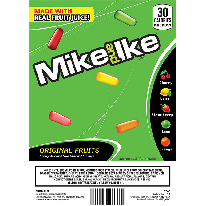 Original MIKE AND IKE® | Original Fruits Flavors | Just Born Experience the delightful sweetness of fruity chewy candy with MIKE AND IKE ® Original Fruits, bursting with five FRUCHEWY ® flavors including Cherry, Lemon, Lime, Orange and Strawberry. MIKE AND IKE ® Original Fruits have been a fan favorite for over 80 years! Buy Online Find Product Available In Nutrition Facts Original Fruits Theater Box