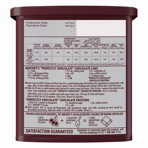 Wegmans 16 oz. $6.79 / ea ($0.42/oz) 1. Add to Cart. 12B. Gluten Free (Other Brands) Gluten Free (Other Brands) HERSHEY'S naturally unsweetened cocoa made of 100% cocao is a staple in every pantry. From pies, cakes, bars and cookies to hot cocoa, brownies, truffles, frosting and waffles, HERSHEY'S cocoa is ready to help you whip up some amazing ... Hershey's Cocoa Powder May Be Healthier Than You Thought Cocoa powder has an excellent macronutrient profile. Two tablespoons of cocoa contain about 25 calories, according to the U.S. Department of Agriculture. They also supply 6 grams of carbohydrate, 3.5 grams of fiber, 2 grams of protein and 1.5 grams of fat. These numbers make cocoa powder a low-calorie, low-fat food that's high in fiber.