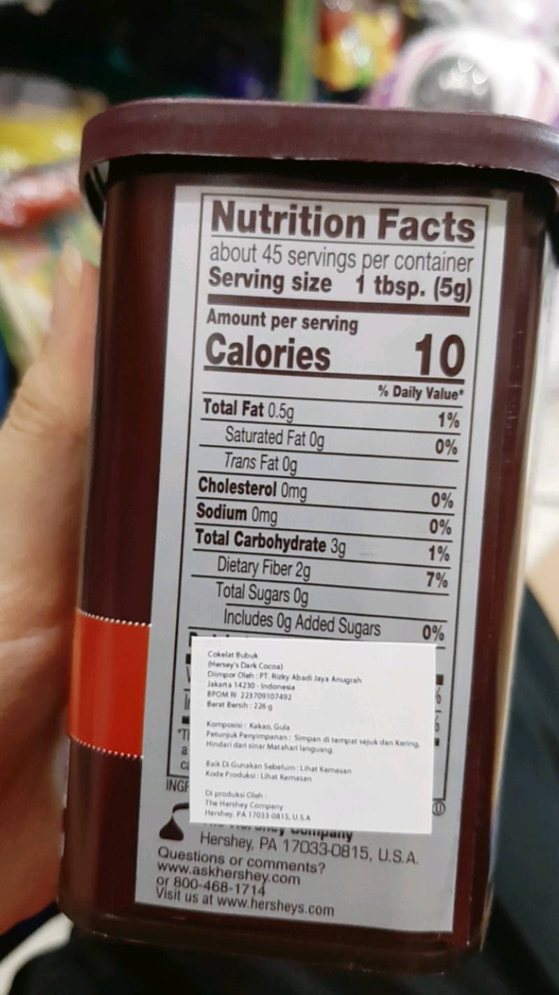 Hershey's Cacao Powder Might Be Healthier Than You Thought COCOA POWDER EVERY DAY Cocoa Powder and Dark Chocolate Health Benefits and Why You Should Have It Show Description Believe it or not, eating cocoa powder daily is one of the healthiest things you can do. Cocoa or cocoa powder improves heart health, fights oxidation, rejuvenates us and much more. HERSHEY'S SPECIAL DARK - Dark Cocoa - SmartLabel™ Nutrition Facts about 45 servings per container Serving Size 1 tbsp (5g) Amount per serving Calories 10 % Daily Value* Total Fat 0.5g 1% Saturated Fat 0g 0% Trans Fat 0g Cholesterol 0mg 0% Sodium 55mg 2% Total Carbohydrate 3g 1% Dietary Fiber 1g 4% Total Sugars 0g Protein <1g Vitamin D 0iu 0% Calcium 6.9mg 0% Iron 2.1mg 10% Potassium 90mg 3% Cocoa Powder 101: Nutrition Facts and Health Benefits Per 100 grams, cocoa powder contains well over 50 grams of carbohydrate. However, the vast majority of this carbohydrate comes from fiber, with 33 grams of fibrous carbs per 100 grams. Compared to simple sugars and starch, our body does not break soluble fiber down into glucose, so it does not affect blood glucose or insulin levels. Hershey's - Natural Unsweetened Cocoa Powder - MyFitnessPal Nutritional Info. Carbs 3 g. Dietary Fiber 2 g. Sugar 0 g. Fat 0 g. Saturated 0 g. Polyunsaturated 0 g. Monounsaturated 0 g. Trans 0 g. Protein 1 g. Sodium 0 mg. Potassium 0 mg. Cholesterol 0 mg. Vitamin A 0 % Vitamin C 0 % Calcium 0 % Iron 2 % ... Hershey's Cocoa Powder. HERSHEY'S COCOA NATURAL UNSWEETENED. Hershey's.