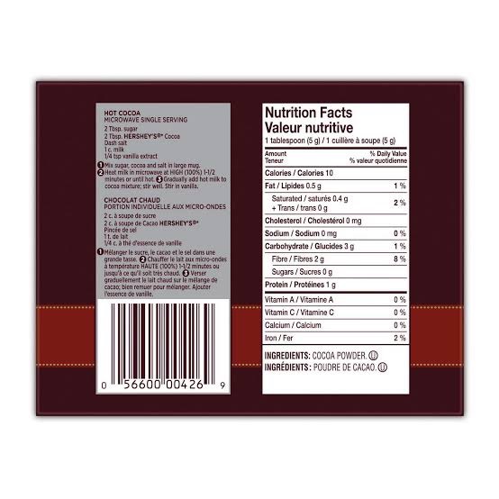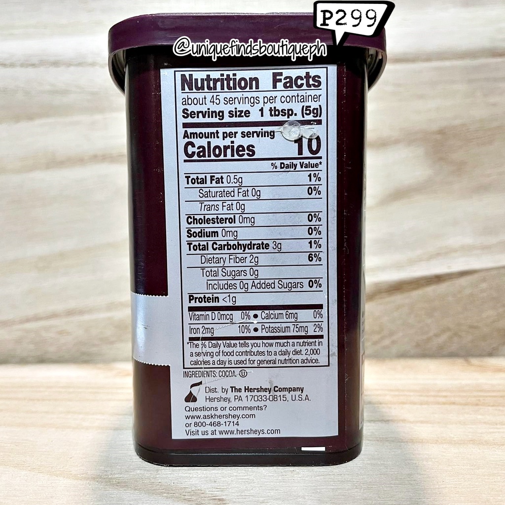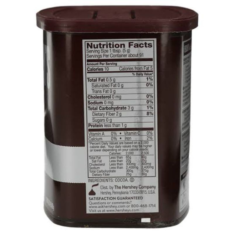 HERSHEY'S COCOA 100% Cacao Natural Unsweetened Cocoa Nutrition Information Nutrition Facts Servings Per Container about 45 Serving size 1 tbsp Amount per serving Calories 10 % Daily Value* Total Fat 0.5g 1% Saturated Fat 0g 0% Trans Fat 0g Cholesterol 0mg 0% Sodium 0mg 0% Total Carbohydrates 3g 1% Dietary Fiber 2g 6% Total Sugars 0g Includes 0g Added Sugar 0% Protein 1g Vitamin D 0.0mcg 0%