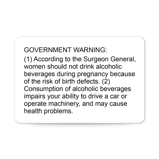 PDF A brief summary of health warning labels on alcoholic beverages - Eurocare 6 Stockwell (2006) A Review of Research into Impacts of alcohol Warning Labels On Attitudes And Behaviour. Centre for addications Research of BC Canada 7 Dell, C.A. and Roberts, G. (2005) Research Update: Alcohol use and pregnancy: An ... warning label: 1) on drinking during pregnancy and 2) a general health warning to be placed on containers ... Alcohol warning labels to reduce alcohol-related harm: a ... - PubMed Objective: This scoping review aims to explore international literature relating to alcohol warning labels as a public health approach for reducing alcohol-related harm. Introduction: Alcohol-related harm is a global public health issue. More than 200 injuries, diseases and conditions are attributable to alcohol, and almost 6% of all global deaths are related to alcohol consumption.A common ... Alcohol Warning Safety Signs from ComplianceSigns.com warning it is illegal to sell whiskey, wine or beer to any person under twenty-one years of age and it is illegal for any person under twenty-one years of age to possess or to attempt to purchase the same identification cards which appear to be fraudulent when presented by purchasers may be confiscated by the establishment and turned over to a … (Large 10 Pack) Alcohol/Beer/Wine - Government Warning Label for ... CFR 16.22 requires labels to be of a certain size and typeset to comply. Two sizes available: Large for growlers holding more than 101 ounces. Label size - 5.5" x 2.13" -- Medium for growlers holding between 8 ounces and 101 ounces. 4.25" x 1.38" handmade 20PCS Contains Alcohol Warning Labels Stickers Sticker Label 16 1 offer from $5.99
