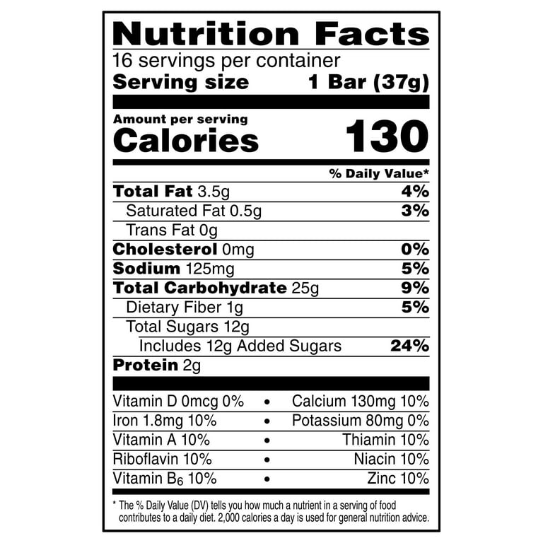 Solved A nutrition facts panel for NutriGrain blueberry bars | Chegg.com A nutrition facts panel for NutriGrain blueberry bars says that a serving is one NutriGrain bar and each NutriGrain bar weighs 37 grams and has 3 grams of fat, 24 grams of carbohydrate, 2 grams of protein and 131 Calories. Show your math. 1. What percent of the total weight of this product comes from carbohydrate? 2. What percent of kcalories ...