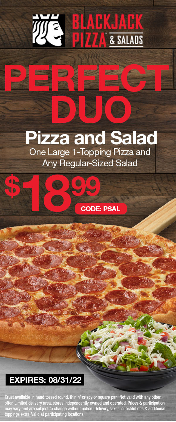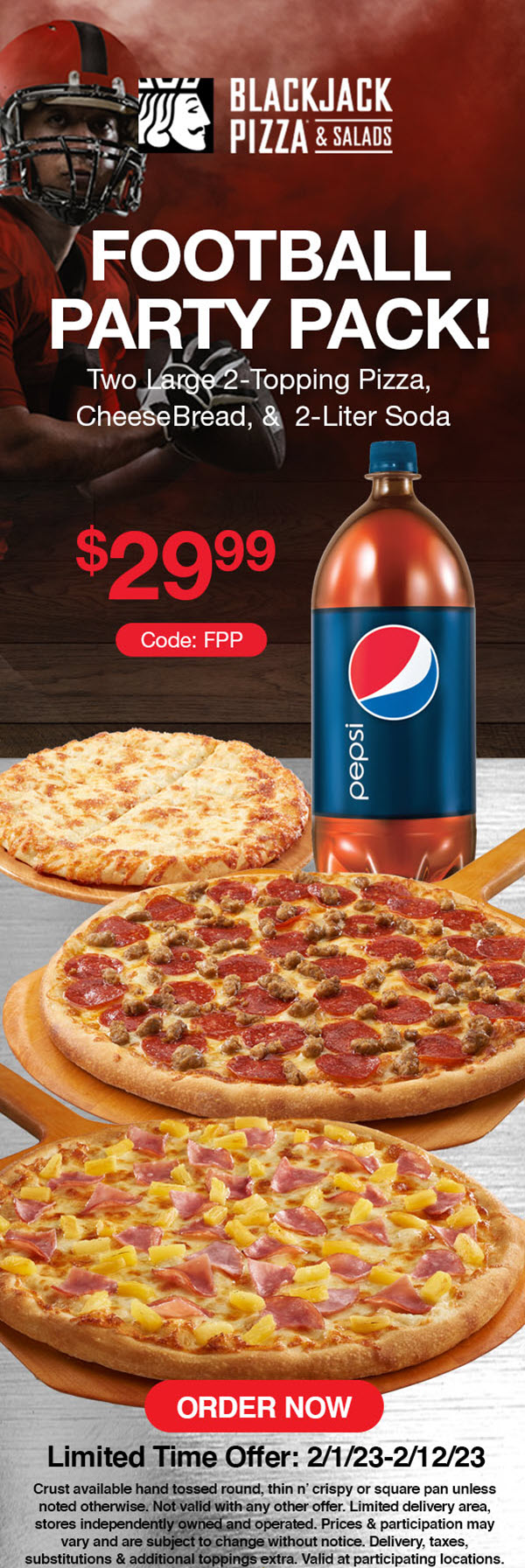 Blackjack Pizza Coupons, Promo Codes & Offers (Feb 2023) There are currently 20 active Blackjack Pizza coupons and deals that can be found here at Coupons.pizza. The most recent coupon is Family Deal: 2 Large 2 Topping Pizzas, Bread and 2L for $31.99 with promo code LFD. Check back frequently for more 2023 Blackjack Pizza coupon codes and discounts.