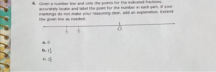 Locating Fractions Less than One on the Number Line Mark and label the point $\frac23$ on the number line. Be as exact as possible. Mark and label the points $\frac12$, $\frac13$, $\frac14$, and $\frac15$ on the number line. ... but this is the first time they will use the number line to represent fractions. Some may have difficultly creating equal sized intervals, especially for thirds and ...