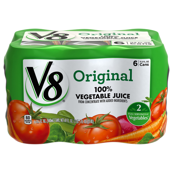 V8 Original 100% Vegetable Juice, Vegetable Blend with Tomato Juice, 64 ... V8 Original 100% Vegetable Juice . Give your body the nutrition it needs to lead a life full of vitality with V8 Original 100% Vegetable Juice. This delicious plant-powered juice is made with a unique and satisfying blend of tomato and other vegetables. ... Gluten free V8 juice contains a flavorful mix of vegetable juices and tomato juice. This ...